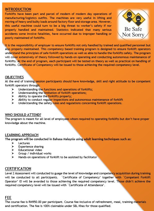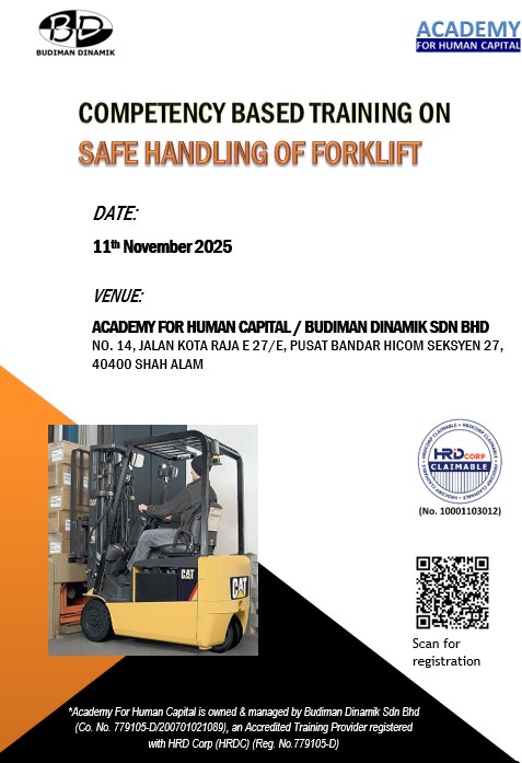 Budiman Dinamik Sdn Bhd / Academy For Human Capital will be organising a public Competency Based Training On Safe Handling of Forklift on 11th November 2025 in Pusat Bandar HICOM, Seksyen 27, 40400 shah Alam. For those interested please fill up this GF Registration of CBT n Safe Handling of Forklift or DM 017-2470257 for registration.